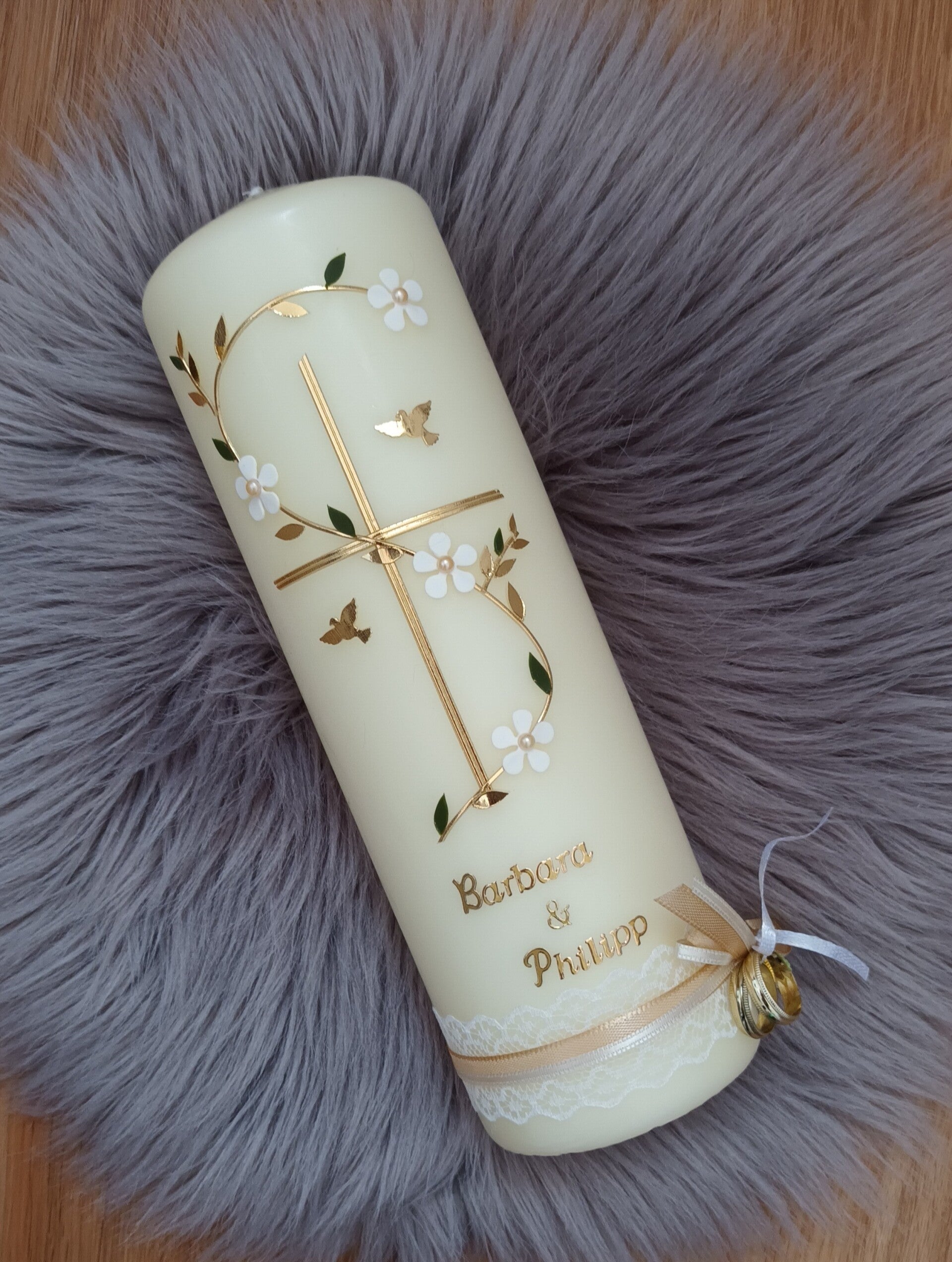 Hochzeitskerze, Traukerze Cremeweiss ,,kreuz grün gold''