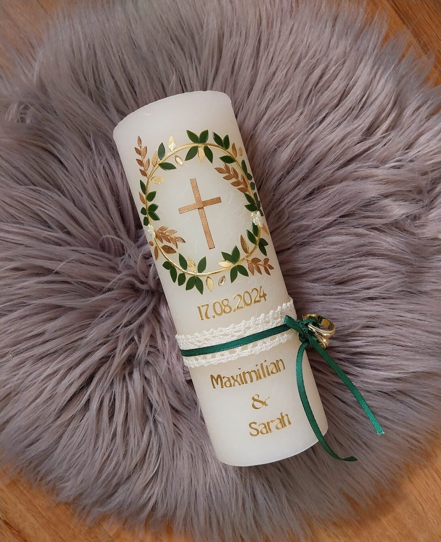 Hochzeitskerze, Traukerze Rustik Vintage ,,Kranz mit Kreuz"