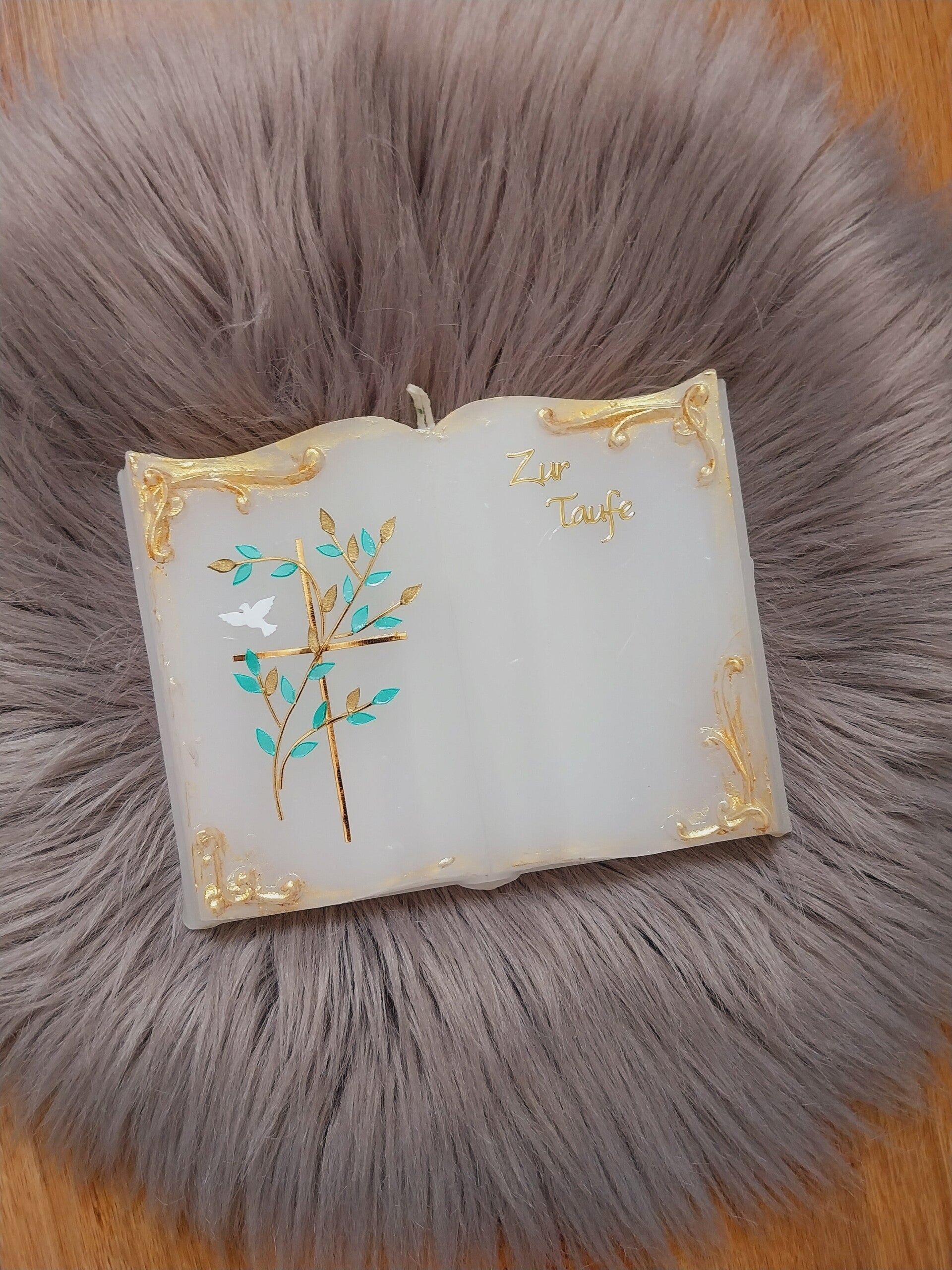 Taufkerze Buch ,,Kreuz ,,Mintgrüne Zweige''