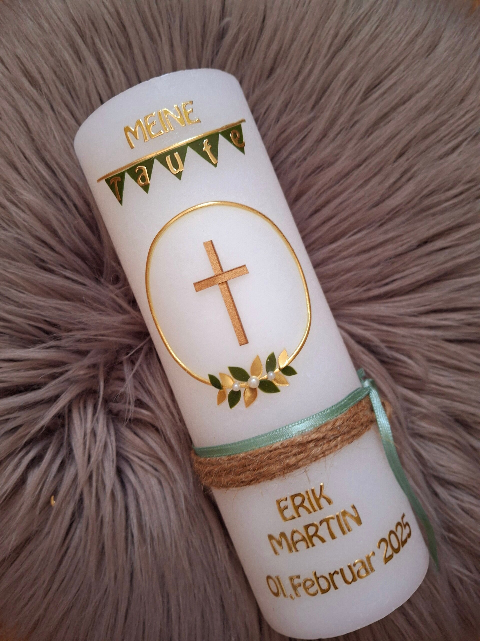 Bei mir finden Sie liebevoll gestaltete, personalisierte Kerzen, die jeden besonderen Moment unvergesslich machen. Ob mit Namen, Datum oder einem individuellen Taufspruch – ich fertige einzigartige Taufkerzen im stilvollen Rustik- oder Vintage-Design, die perfekt für Mädchen und Jungen geeignet sind. Auch Patenkerzen, Kommunionkerzen und Hochzeitskerzen gehören zu meinem Angebot. Jede Kerze wird von mir mit größter Sorgfalt und Liebe zum Detail handgemacht, um Ihren ereignisreichen Tag unvergesslich zu machen. Lassen Sie mich Ihre Wünsche umsetzen und schaffen Sie mit einer individuellen Kerze ein besonderes Erinnerungsstück!