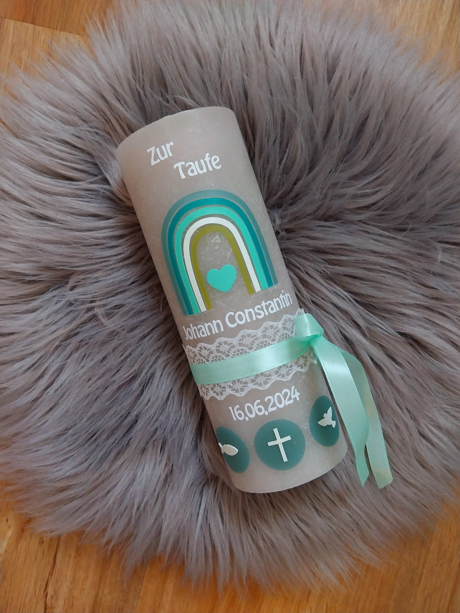 Taufkerze rustik Junge ,,Regenbogen grün"