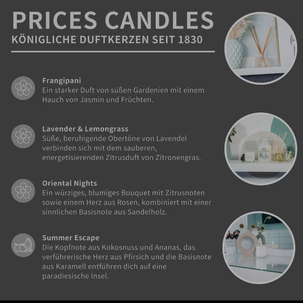 Entdecke die Duftwelt von Price's Candles, einem traditionsreichen Kerzenhersteller, der bereits 1830 gegründet wurde. Seit 1850 beliefert das Unternehmen sogar das britische Königshaus – ein echtes Zeichen für höchste Qualität und Exklusivität. Jede Kerze erzählt eine Geschichte und bringt einen Hauch königlichen Flairs in dein Zuhause.
