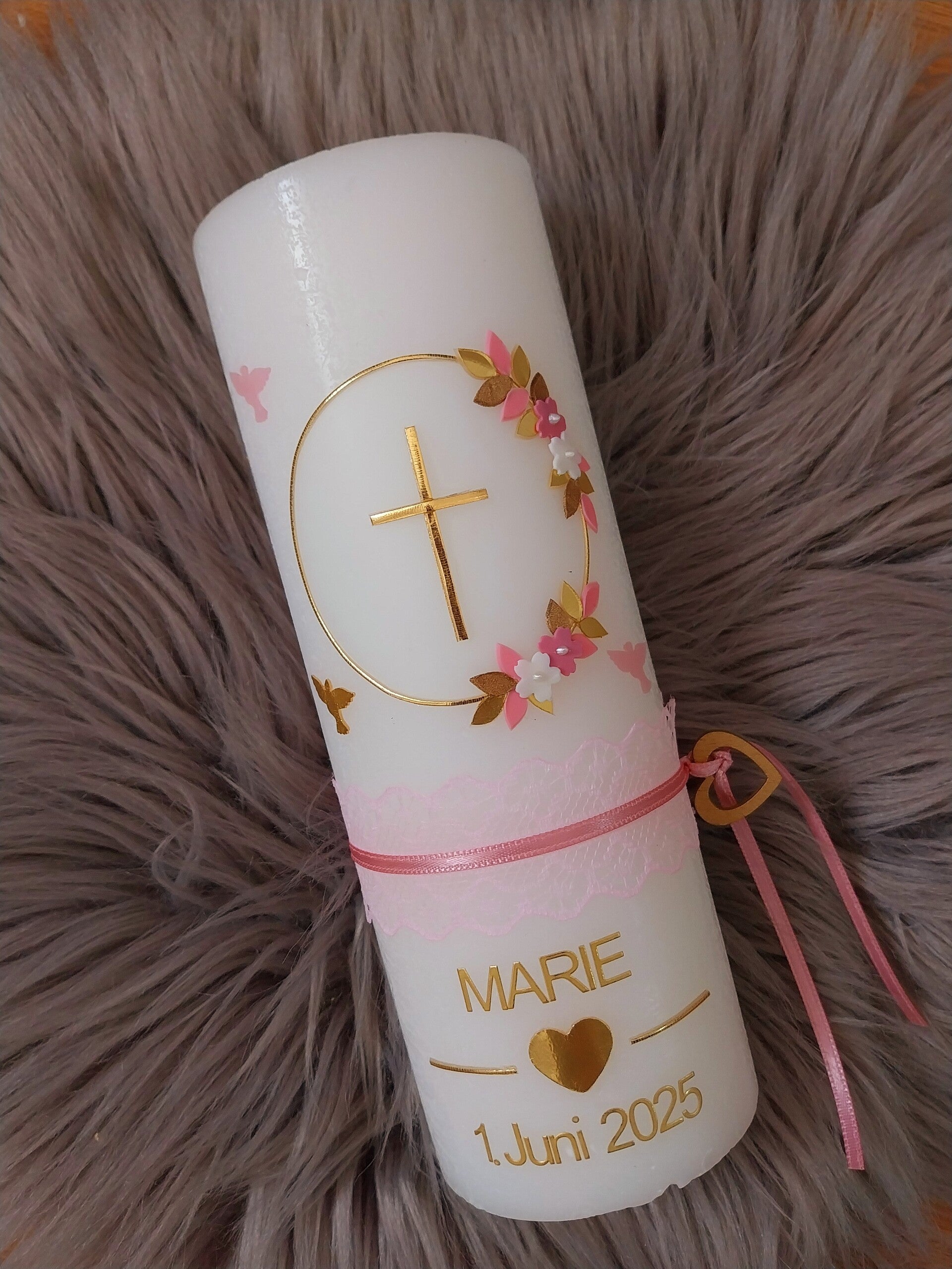 Taufkerze mädchen rustik ,,Kranz rosa Blumen"
