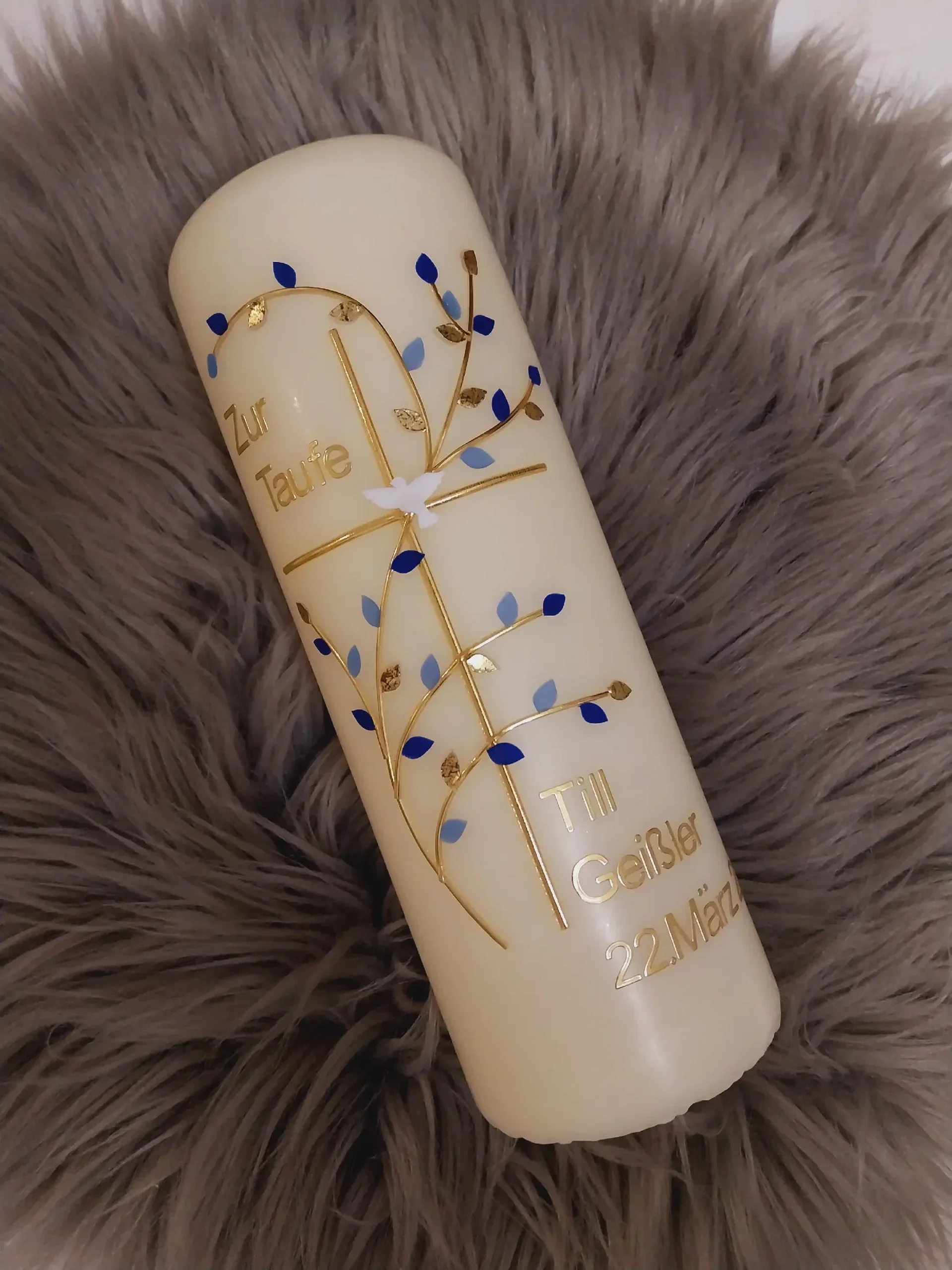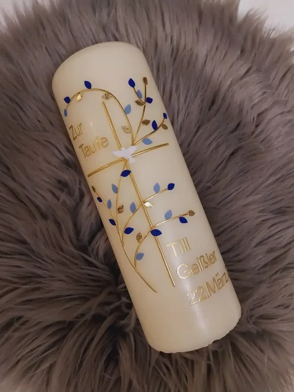 Taufkerze Junge personalisiert, Taufspruch,,goldenes Kreuz mit blauen Zweigen"*